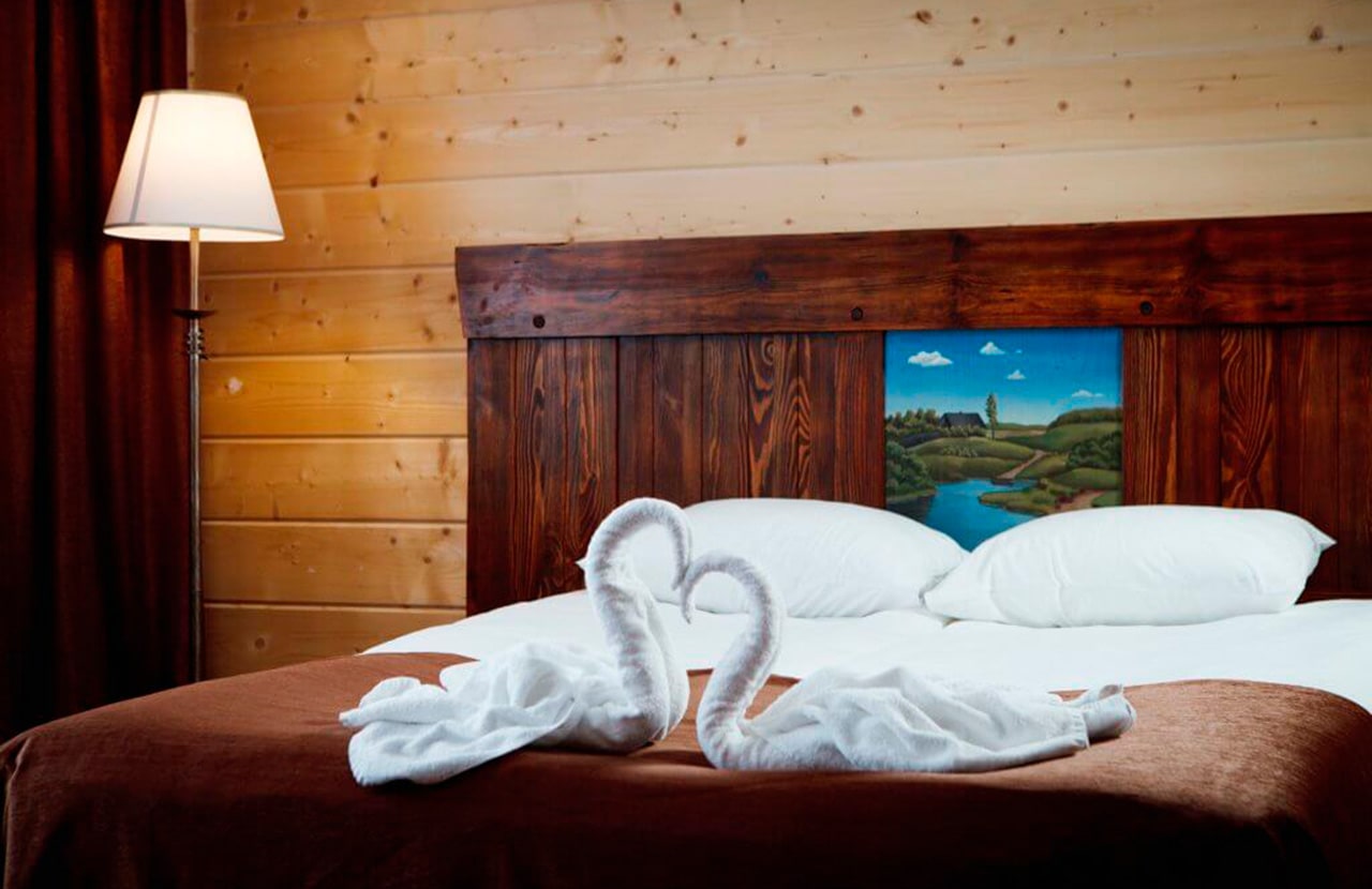 2-комнатные люксы находятся в VIP-корпусах №7 (1 шт.) и №11 (9 шт.). В спальне - 2-спальная кровать, в гостиной – раскладной диван. Возможна установка детской кроватки-люльки в спальне. Площадь номера – 20-25 кв. м.