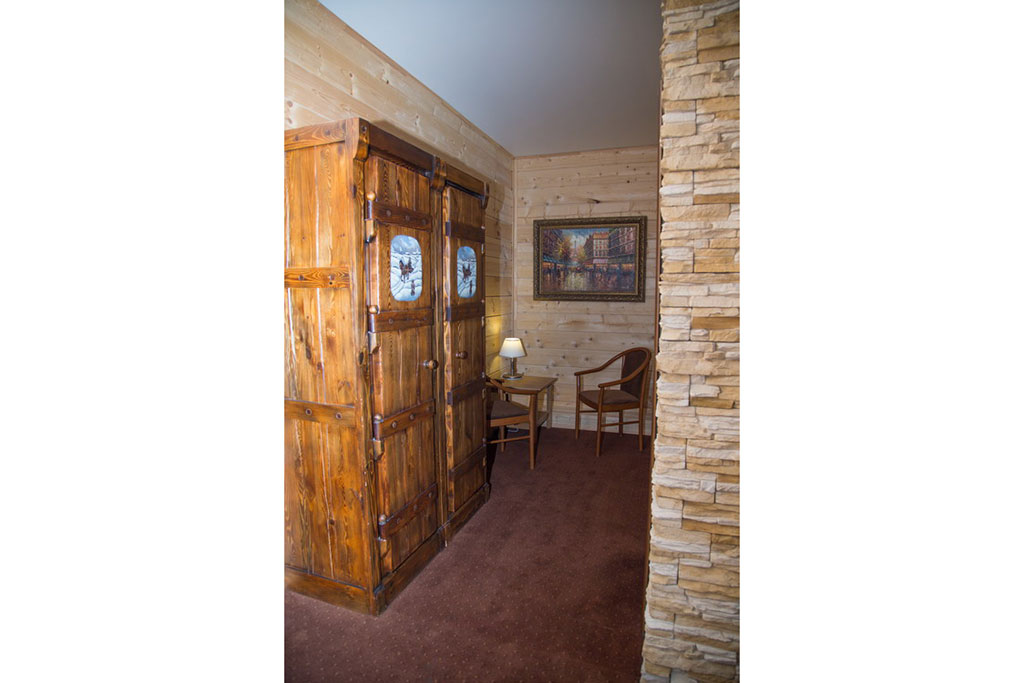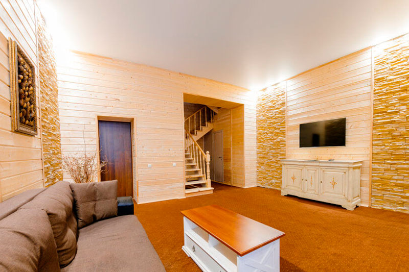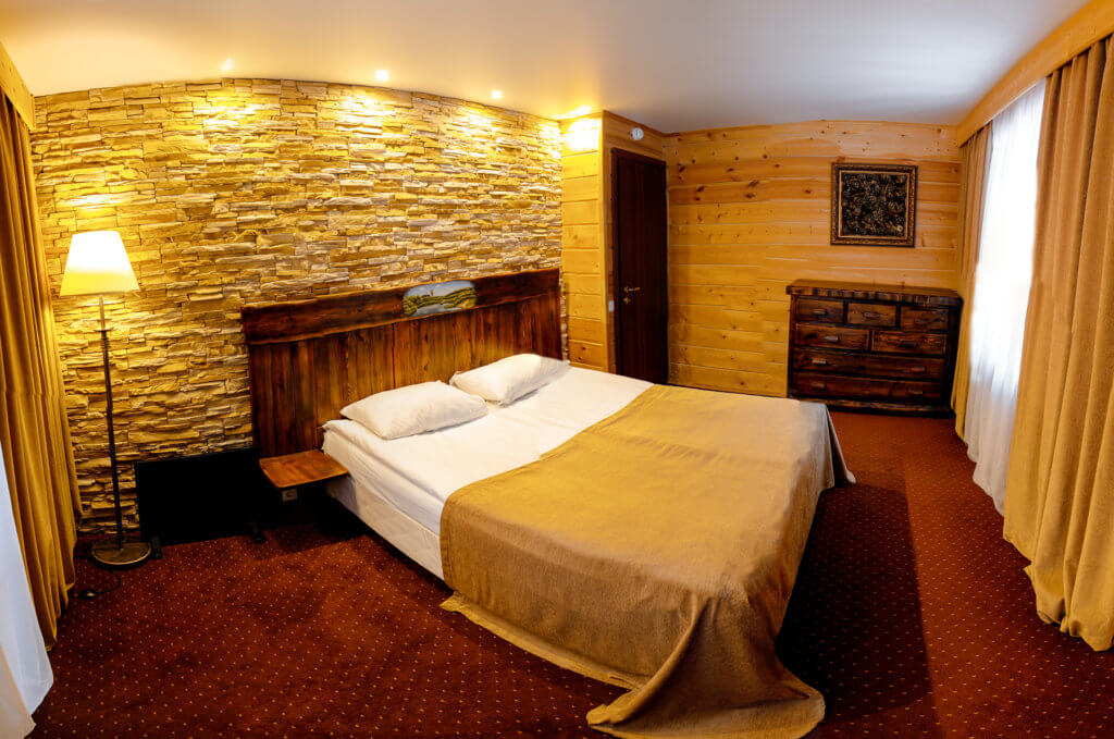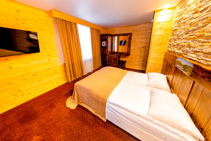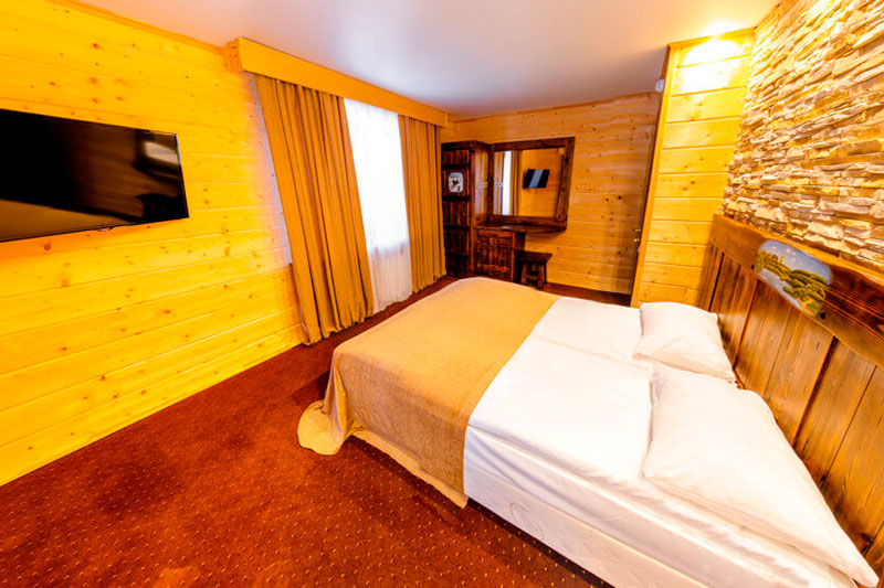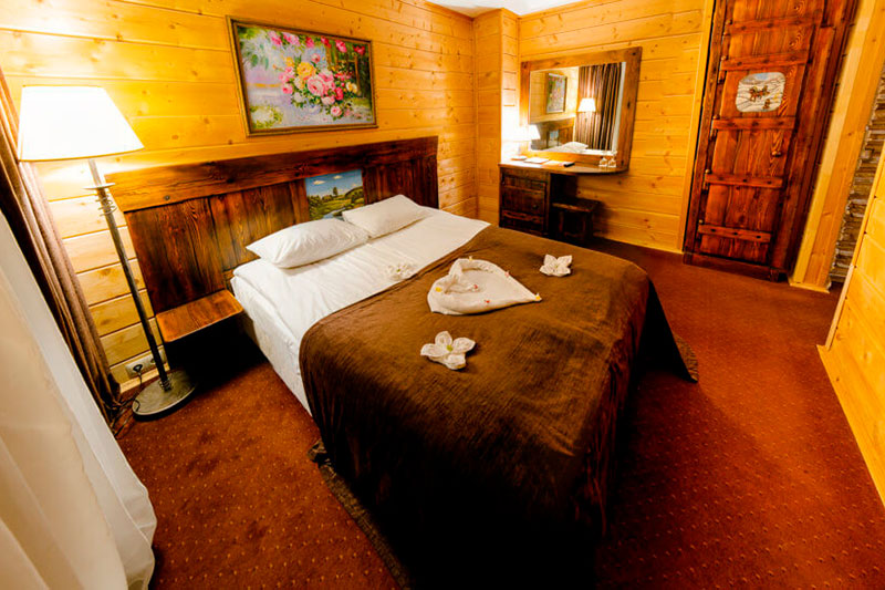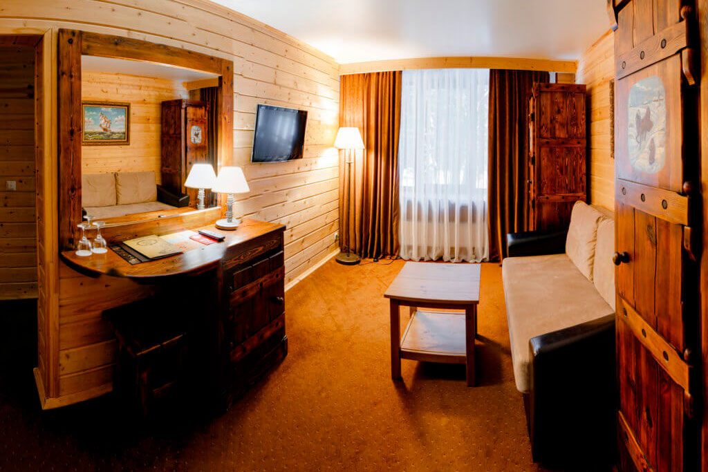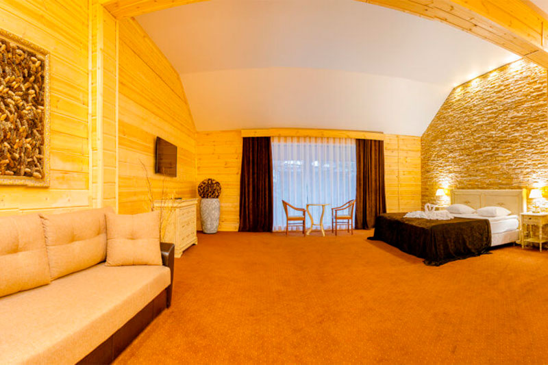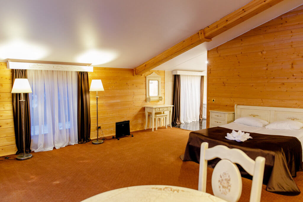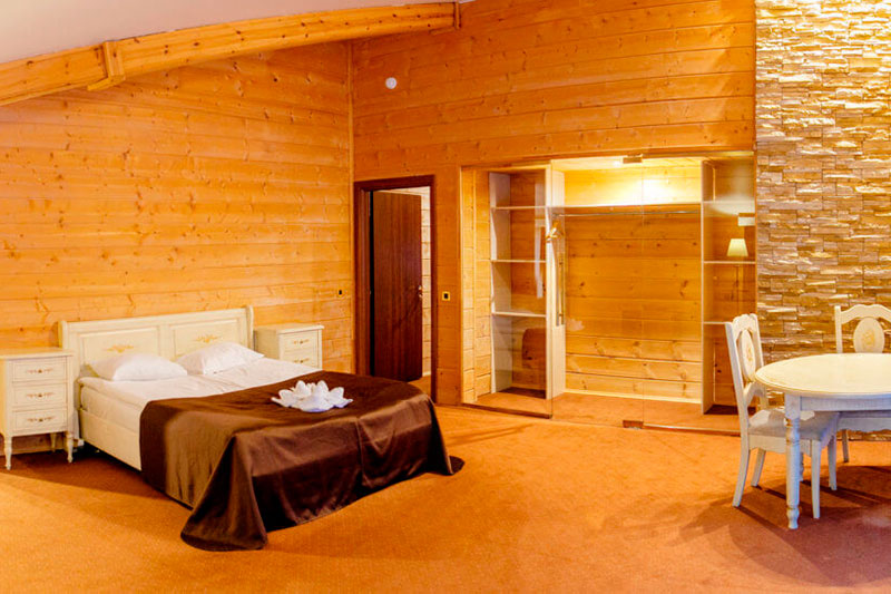 1 этаж: гостиная со столом на 4 персоны, раскладной диван, санузел (ванна, унитаз, биде). 2 этаж: спальня с двуспальной кроватью, раскладной диван, гардеробная и санузел (ванна, унитаз и биде). Возможна установка дополнительного места – еврораскладушки (или детская кроватка-люлька). В номере: сейф, мини-бар, 2 плазменных ТВ (в спальне и в гостиной), два санузла, набор косметики, фен, халаты и тапочки. Теплые полы на 1 и 2 этажах + в санузлах. На втором этаже одно большое центральное окно – не открывается. У каждого номера отдельный вход с улицы.