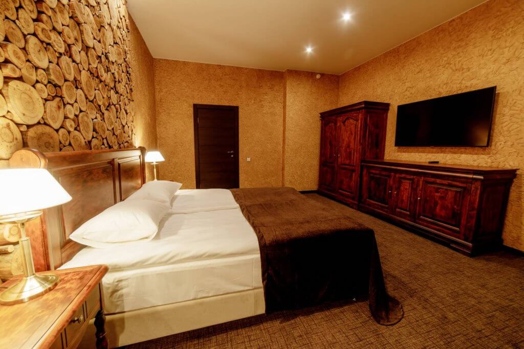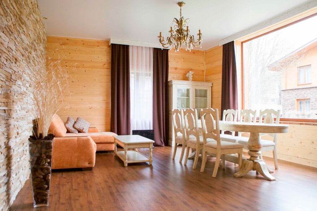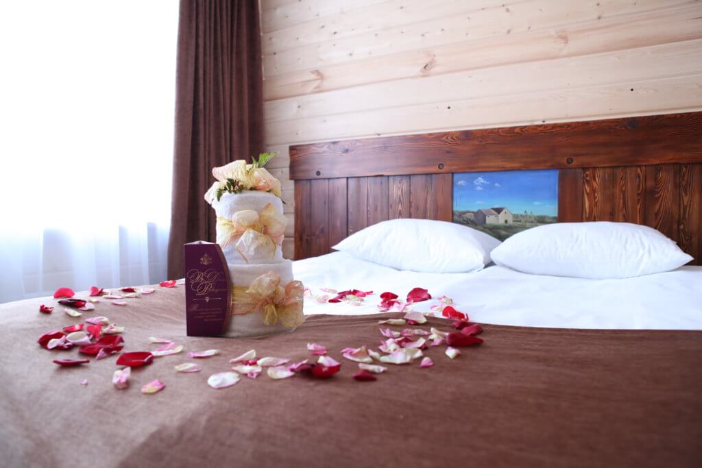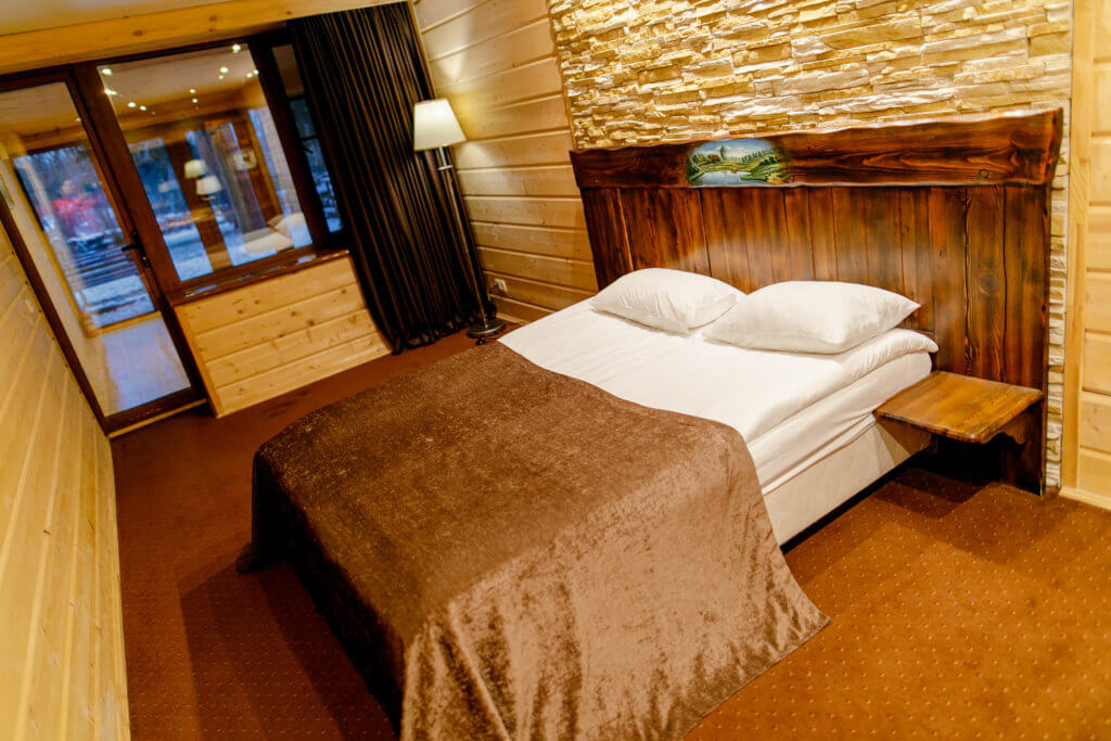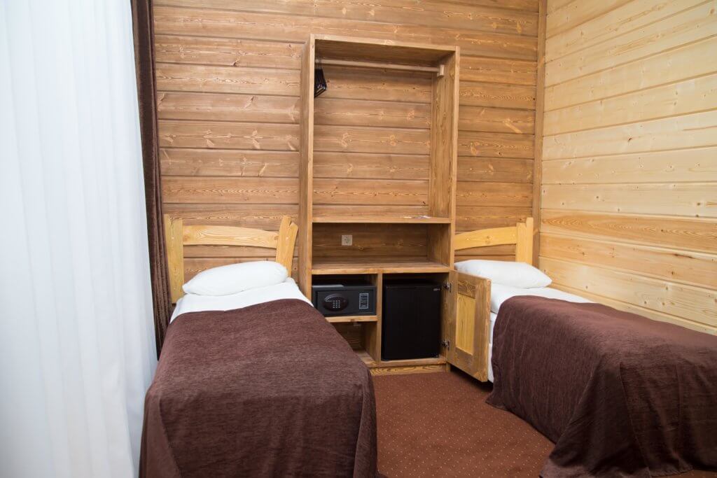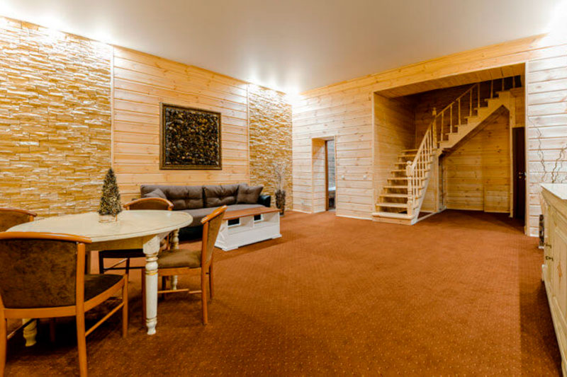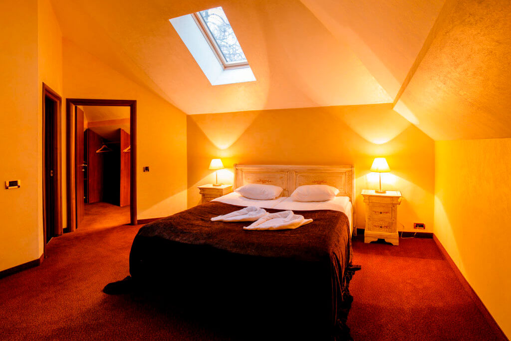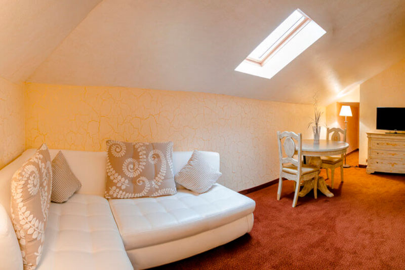 1 этаж: гостиная со столом на 4 персоны, раскладной диван, санузел (ванна, унитаз, биде). 2 этаж: спальня с двуспальной кроватью, раскладной диван, гардеробная и санузел (ванна, унитаз и биде). Возможна установка дополнительного места – еврораскладушки (или детская кроватка-люлька). В номере: сейф, мини-бар, 2 плазменных ТВ (в спальне и в гостиной), два санузла, набор косметики, фен, халаты и тапочки. Теплые полы на 1 и 2 этажах + в санузлах. На втором этаже одно большое центральное окно – не открывается. У каждого номера отдельный вход с улицы.