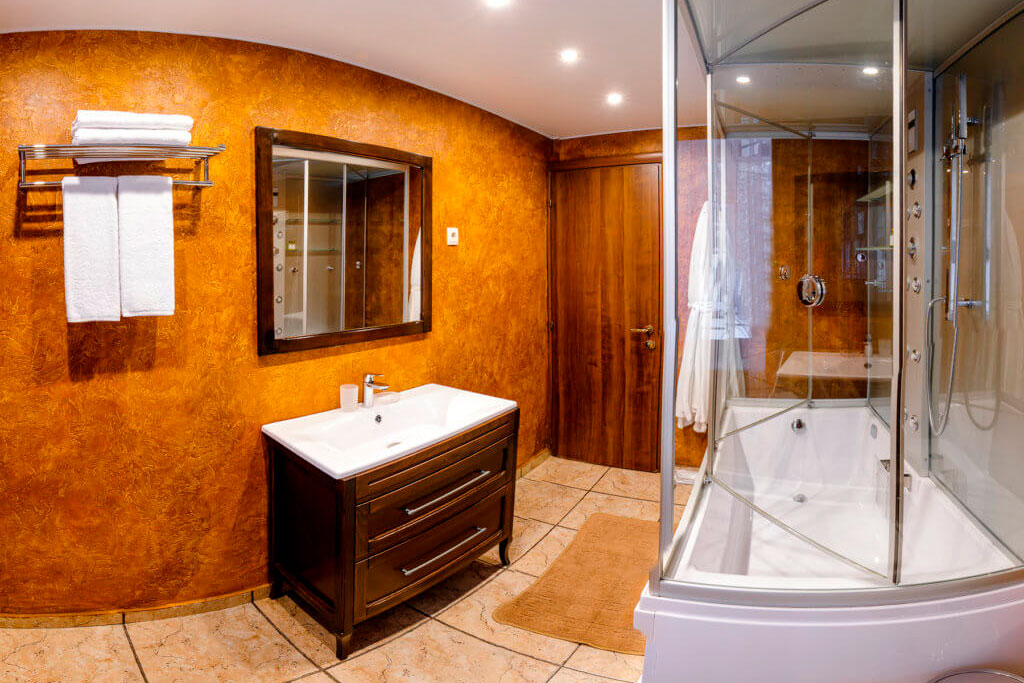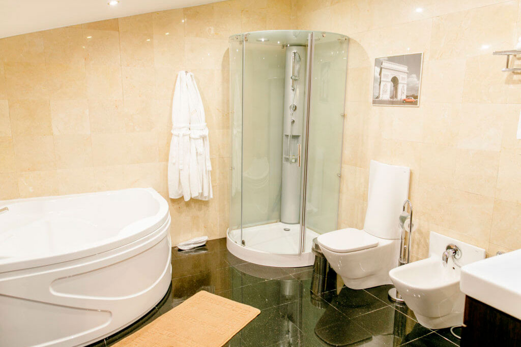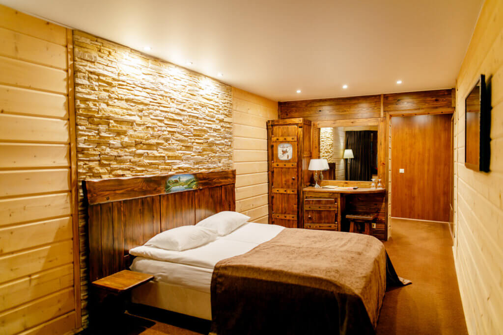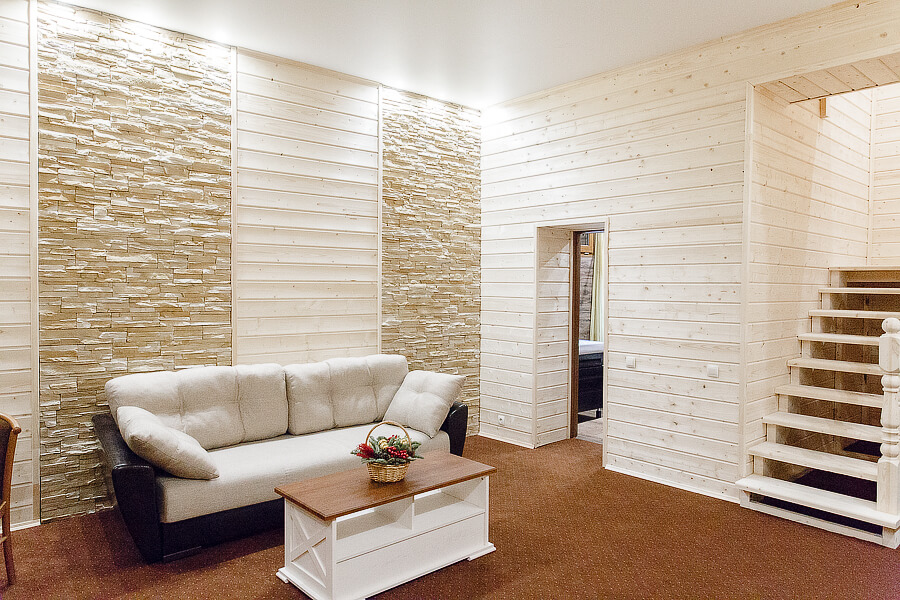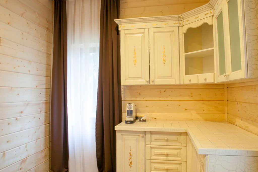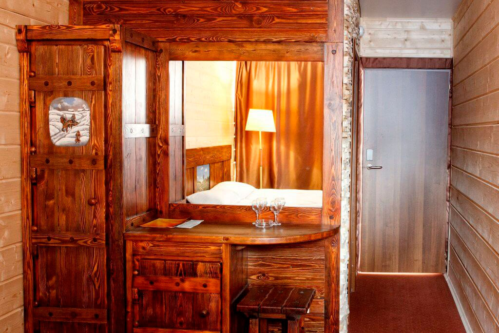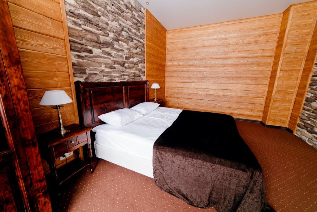 1 этаж: гостиная со столом на 4 персоны, раскладной диван, санузел (ванна, унитаз, биде). 2 этаж: спальня с двуспальной кроватью, раскладной диван, гардеробная и санузел (ванна, унитаз и биде). Возможна установка дополнительного места – еврораскладушки (или детская кроватка-люлька). В номере: сейф, мини-бар, 2 плазменных ТВ (в спальне и в гостиной), два санузла, набор косметики, фен, халаты и тапочки. Теплые полы на 1 и 2 этажах + в санузлах. На втором этаже одно большое центральное окно – не открывается. У каждого номера отдельный вход с улицы.