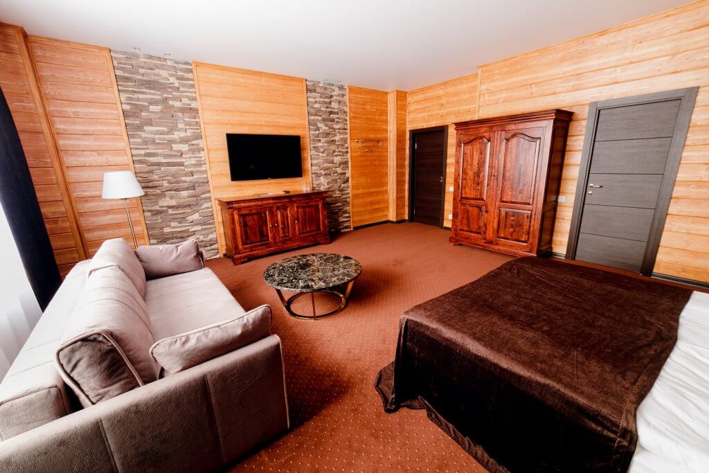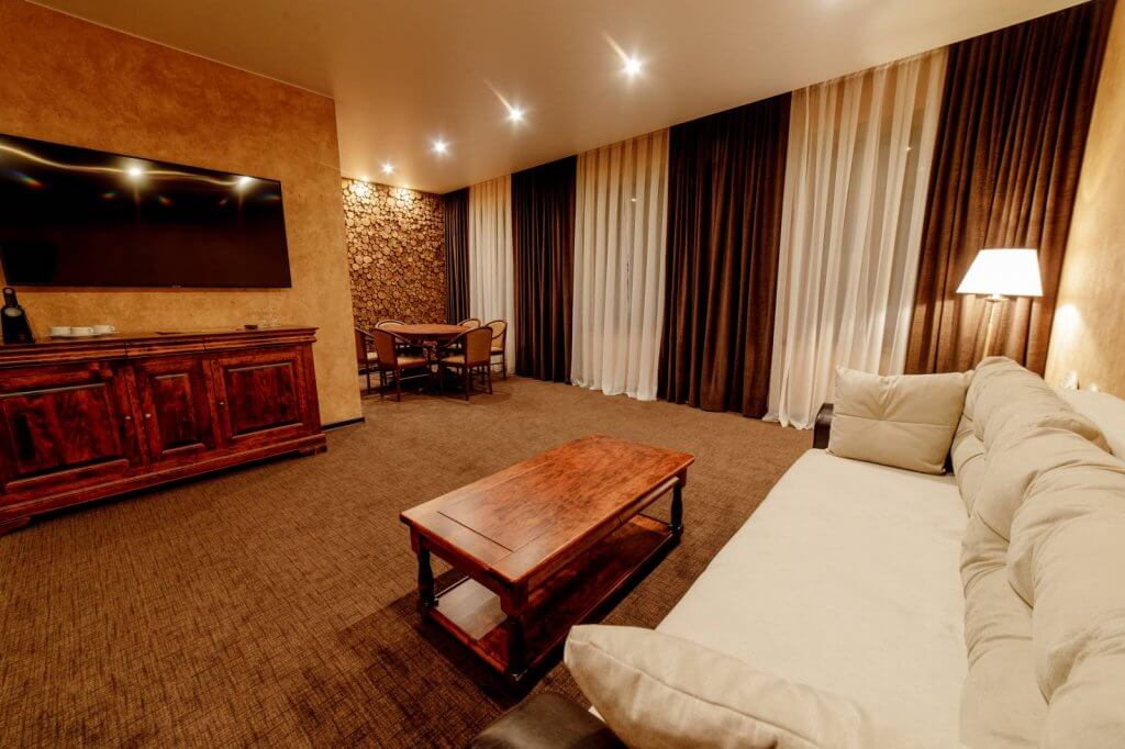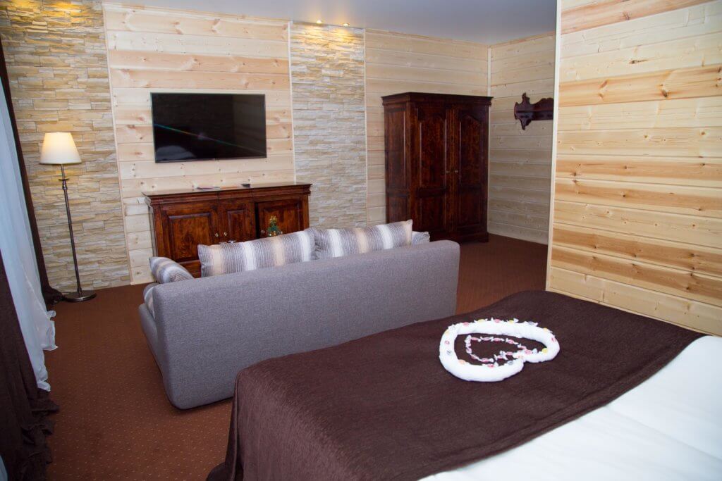 В спальне – одна двуспальная кровать, шкаф, в гостиной (проходная комната) установлен раскладной диван (2 доп. места). Возможна установка 1 доп. детской кроватки-люльки для младенца в спальне. В номере сейф, мини-бар за доп. оплату, 2 плазменных ТВ, в санузле ванная, набор косметики, фен, халаты и тапочки. Номера расположены на 1-3 этажах (лифта нет).