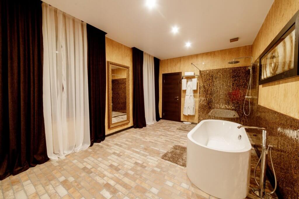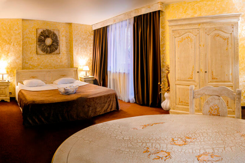 Спальня – одна двуспальная кровать. В номере сейф, мини-бар за доп. оплату, плазменный ТВ, в санузле ванная, набор косметики, фен, халаты и тапочки. Предусмотрена небольшая гардеробная комната. Возможно поставить 1 доп. место (евро-раскладушка) или 1 детскую кроватку-люльку.
