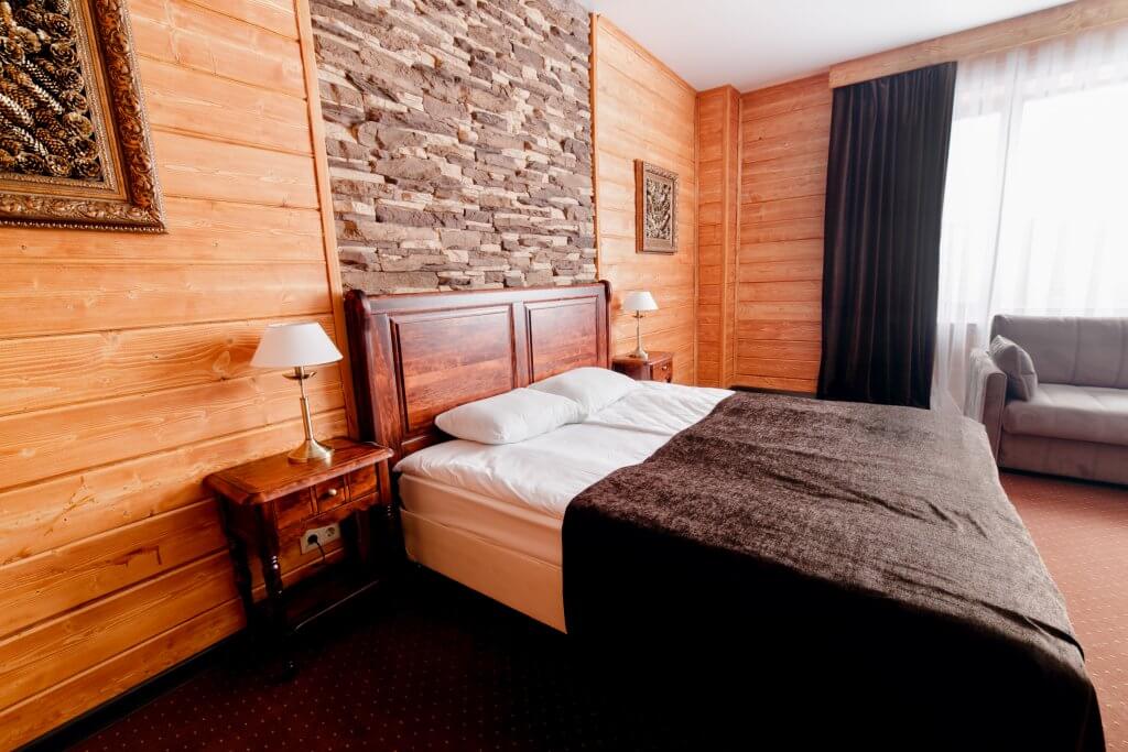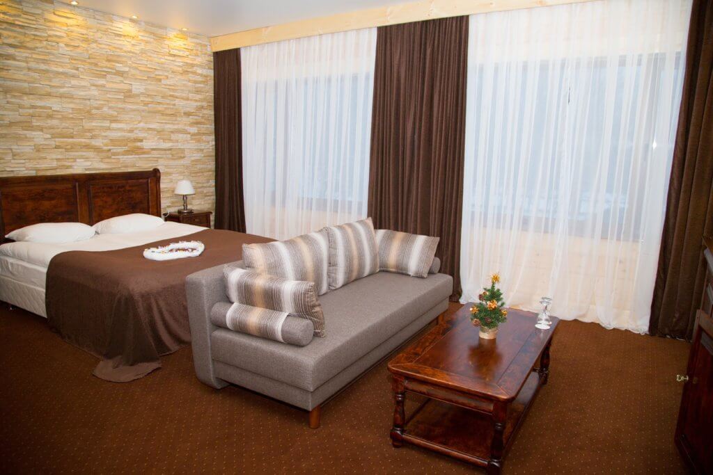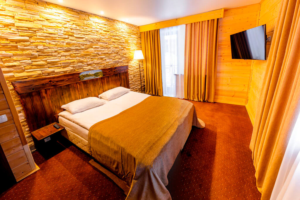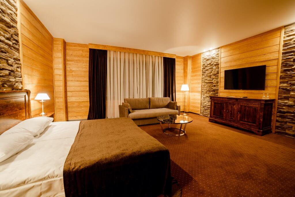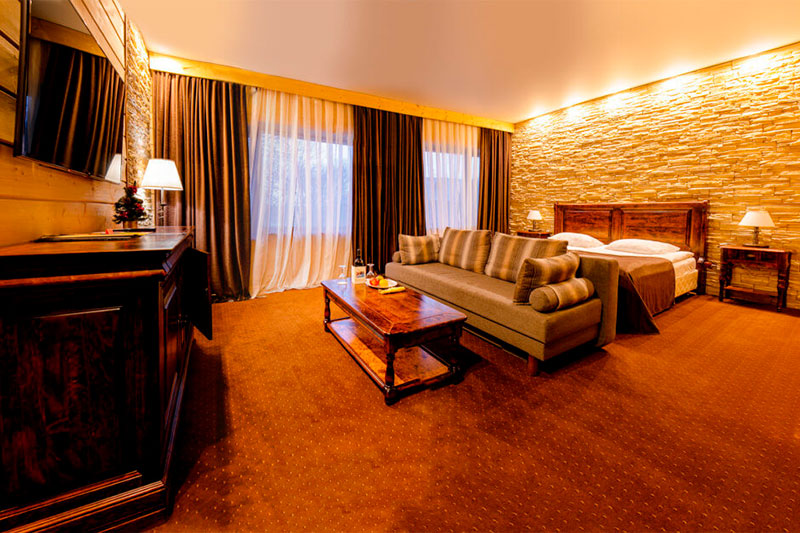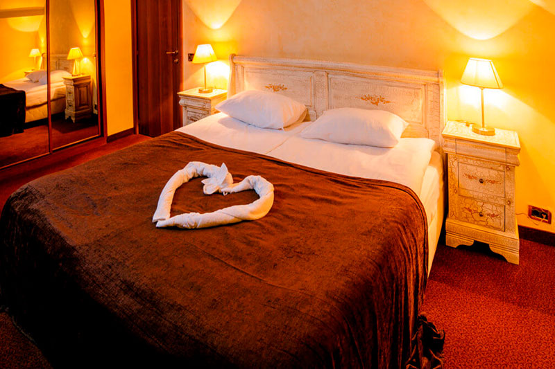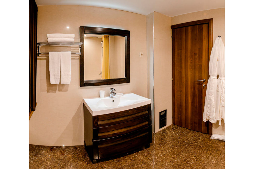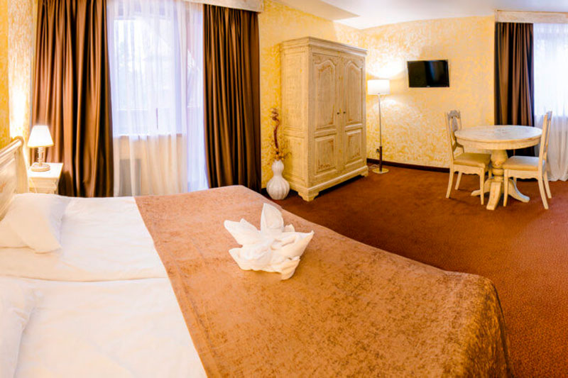 Одна двуспальная кровать и раскладной диван (2 доп. места). В номере сейф, мини-бар за доп. оплату, плазменный ТВ, в санузле ванная, набор косметики, фен, халаты и тапочки. Возможно поставить 1 детскую кроватку-люльку. Номера расположены на 1-3 этажах (лифта нет).