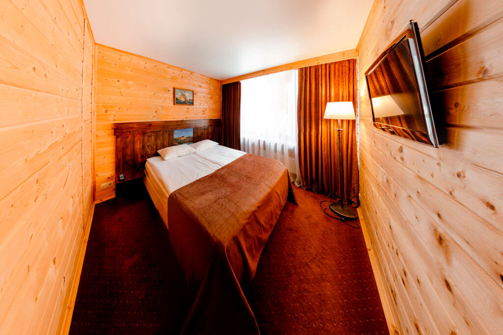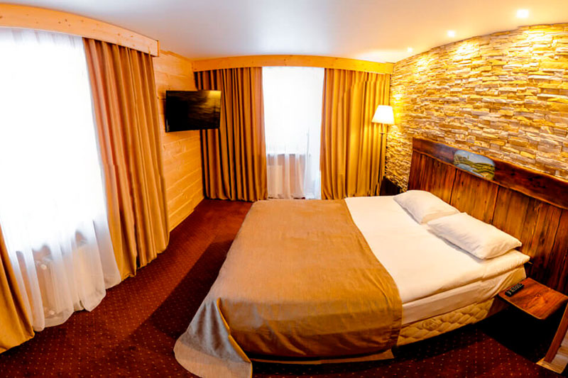 Одна двуспальная кровать. В номере сейф, мини-бар за доп. оплату, плазменный ТВ, маленький столик + 2 стула, в санузле ванная, фен, набор косметики, халаты и тапочки. Просторный санузел с окном. Возможно поставить 1 доп. место (евро-раскладушка) или 1 детскую кроватку-люльку.