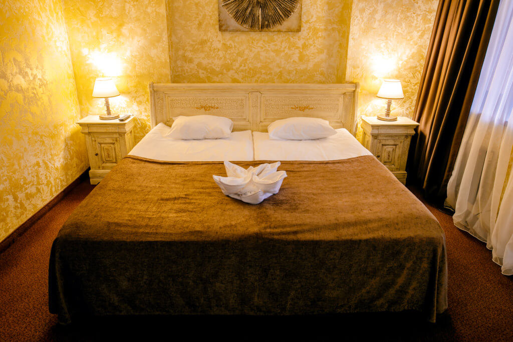 Одна двуспальная кровать. В номере сейф, мини-бар за доп. оплату, плазменный ТВ, в санузле ванная + биде, набор косметики, фен, халаты и тапочки. Просторный санузел с окном. Возможно поставить 1 доп. место (евро-раскладушка) или 1 детскую кроватку-люльку.