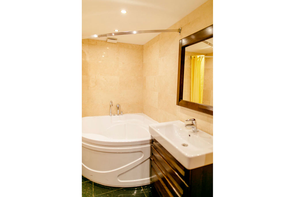 Спальня – одна двуспальная кровать. Гостиная (проходная комната) – раскладной диван. В номере сейф, мини-бар за доп. оплату, 2 плазменных ТВ, в санузле ванная, набор косметики, фен, халаты и тапочки.